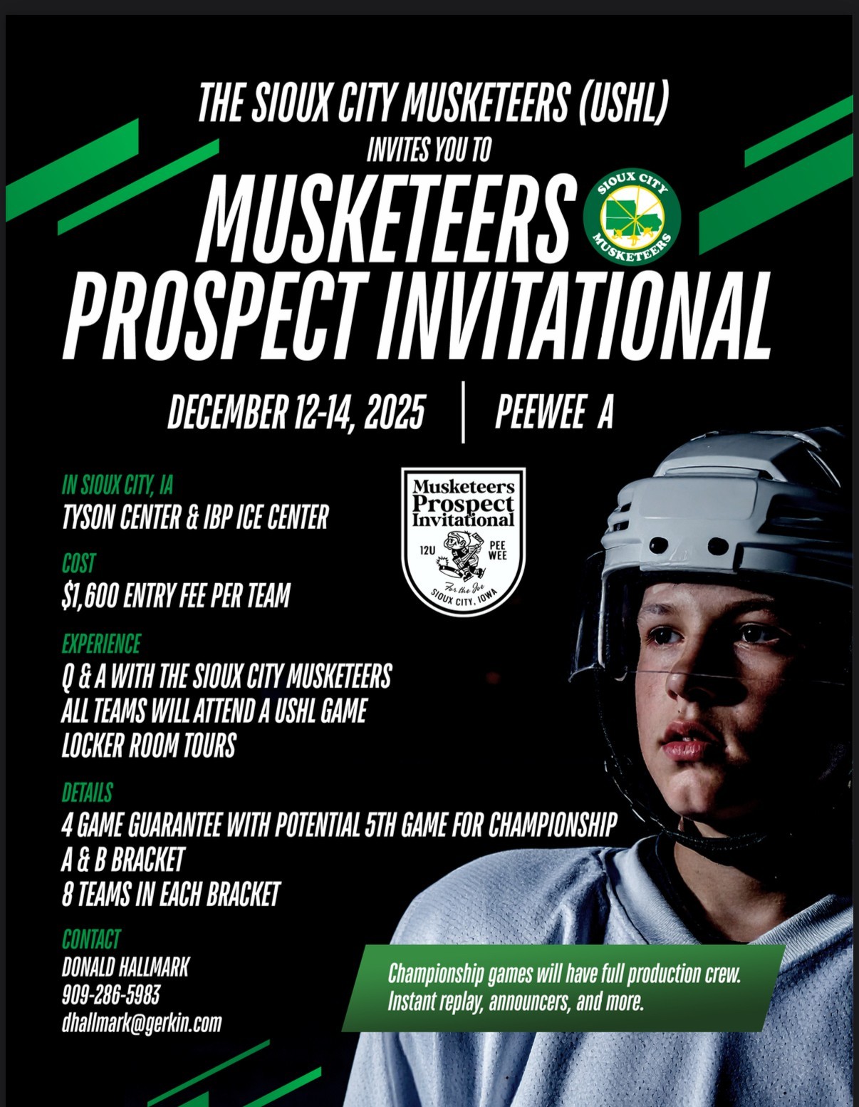 The Siouxland Youth Hockey Association (SYHA), in partnership with the Sioux City Musketeers, is thrilled to host your team to the 2025 Musketeers Prospect Invitational, an exclusive, high energy youth hockey tournament designed to deliver a first-class competitive experience! This invite only event will take place at the state-of-the-art Tyson Event Center and IBP Ice Arena, home of the USHL’s Sioux City Musketeers, promising an unforgettable weekend of hockey, camaraderie and professional level excitement.